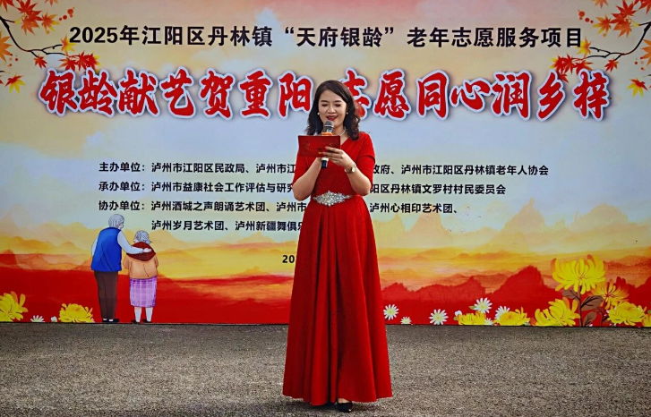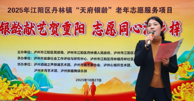 10 月 27 日,2025 年泸州市江阳区丹林镇“天府银龄”老年志愿服务项目重点活动——“银龄献艺贺重阳・志愿同心润乡梓” 文艺系列汇演,首先在丹林镇文罗村与丹林社区温情启幕。活动由泸州市江阳区民政局、丹林镇人民政府、丹林镇老年人协会联合主办,泸州市益康社会工作评估与研究中心承办,泸州酒城之声朗诵艺术团、泸州市曲艺家协会、泸州心相印艺术团、泸州岁月艺术团、泸州新疆舞俱乐部等志愿者团队协办,200 余名村民齐聚现场,在乡土气息与文化魅力交融的演出中,共庆重阳佳节、共享文化盛宴。
