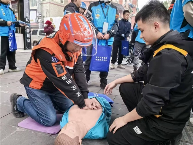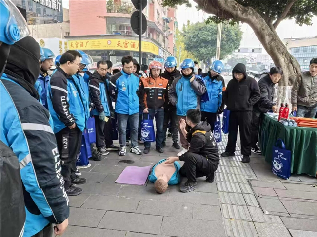 在互动教学环节,工作人员现场演示心肺复苏的操作要领,手把手指导骑手们掌握胸外按压、人工呼吸等关键步骤;通过实物操作教学,详细讲解灭火器等应急器材的使用方法和注意事项,让骑手们在实践中提升应急自救能力。“这次活动太实用了,不仅清楚了职业伤害保障的政策,还学会了急救技能,以后工作更安心了!”一位骑手深有感触地说。