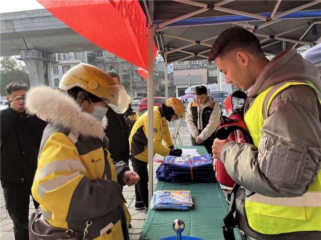活动当天,工作人员结合骑手工作特性,用通俗易懂的语言详细解读了职业伤害保障政策核心内容,包括参保范围、理赔流程、待遇标准等关键信息,让骑手们清晰了解自身权益保障路径。针对骑手配送途中交通安全风险较高的特点,工作人员还系统讲解了道路交通安全法规、骑行安全注意事项,通过典型案例警示骑手杜绝闯红灯、逆行等危险行为,牢记“安全第一、平安配送”。
