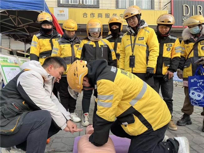 除政策讲解外,工作人员还手把手教授骑手心肺复苏术、海姆立克急救法以及创伤止血包扎等实用应急技能。骑手们认真聆听、踊跃参与,在模拟演练中掌握操作要领。“这些技能不仅能在送餐途中帮助他人,关键时刻或许也能救自己一命。”一位参与培训的骑手感慨道。