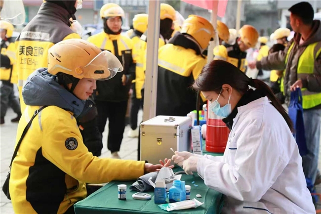 此外,活动特别邀请医疗专家开展义诊服务,为骑手们提供血压测量、健康咨询等服务,并就长期骑行易患的腰椎、关节劳损等职业病问题开展预防科普,从科学作息、饮食调节、日常锻炼等方面给出专业建议。